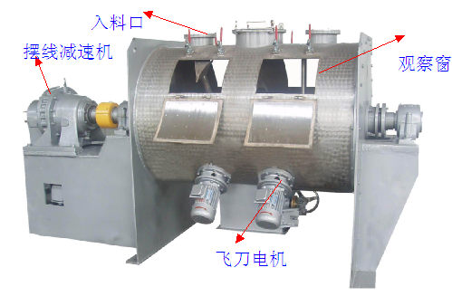 臥式犁刀混合機啟動后犁刀由犁刀軸帶動旋轉(zhuǎn),使物料沿筒體徑向作周向湍動,同時把物料沿犁刀兩側(cè)面的法線方向拋出。當(dāng)被拋出和作周向湍動的物料流經(jīng)飛刀組時,被高速旋轉(zhuǎn)的飛刀迅速、有力地拋散。物料在上述犁刀和飛刀的復(fù)合作用下,不斷疊、擴散、在短時間內(nèi)達到均勻混合,混合精度高。